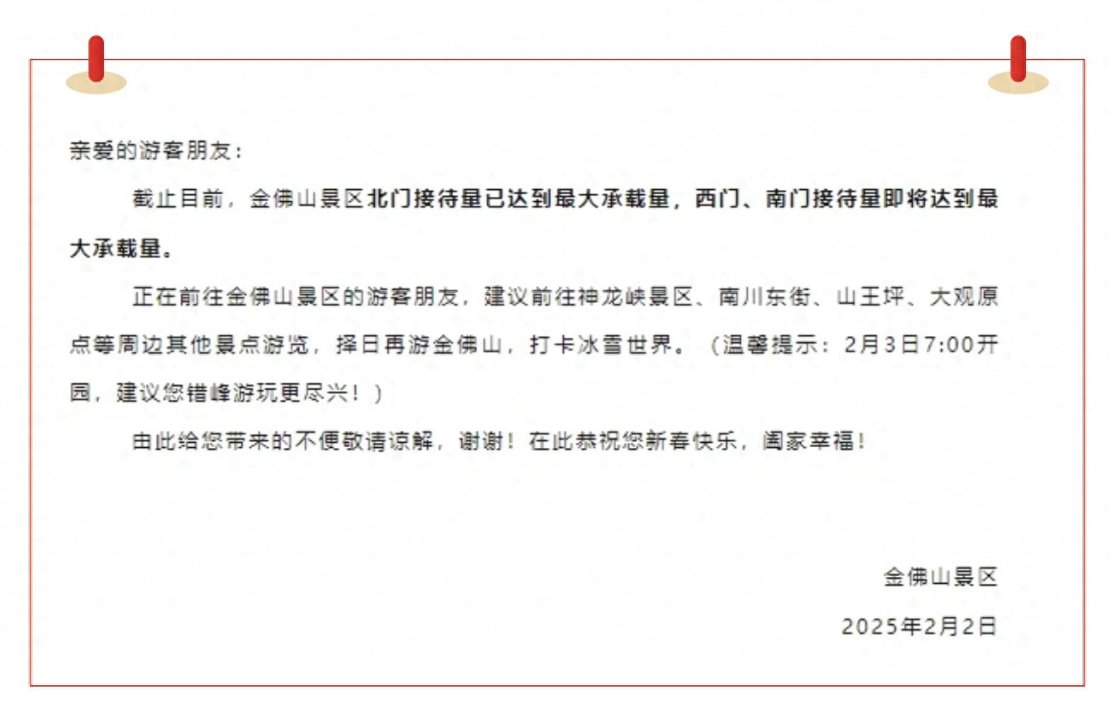 游客瞬时接待量即将达到峰值的公告