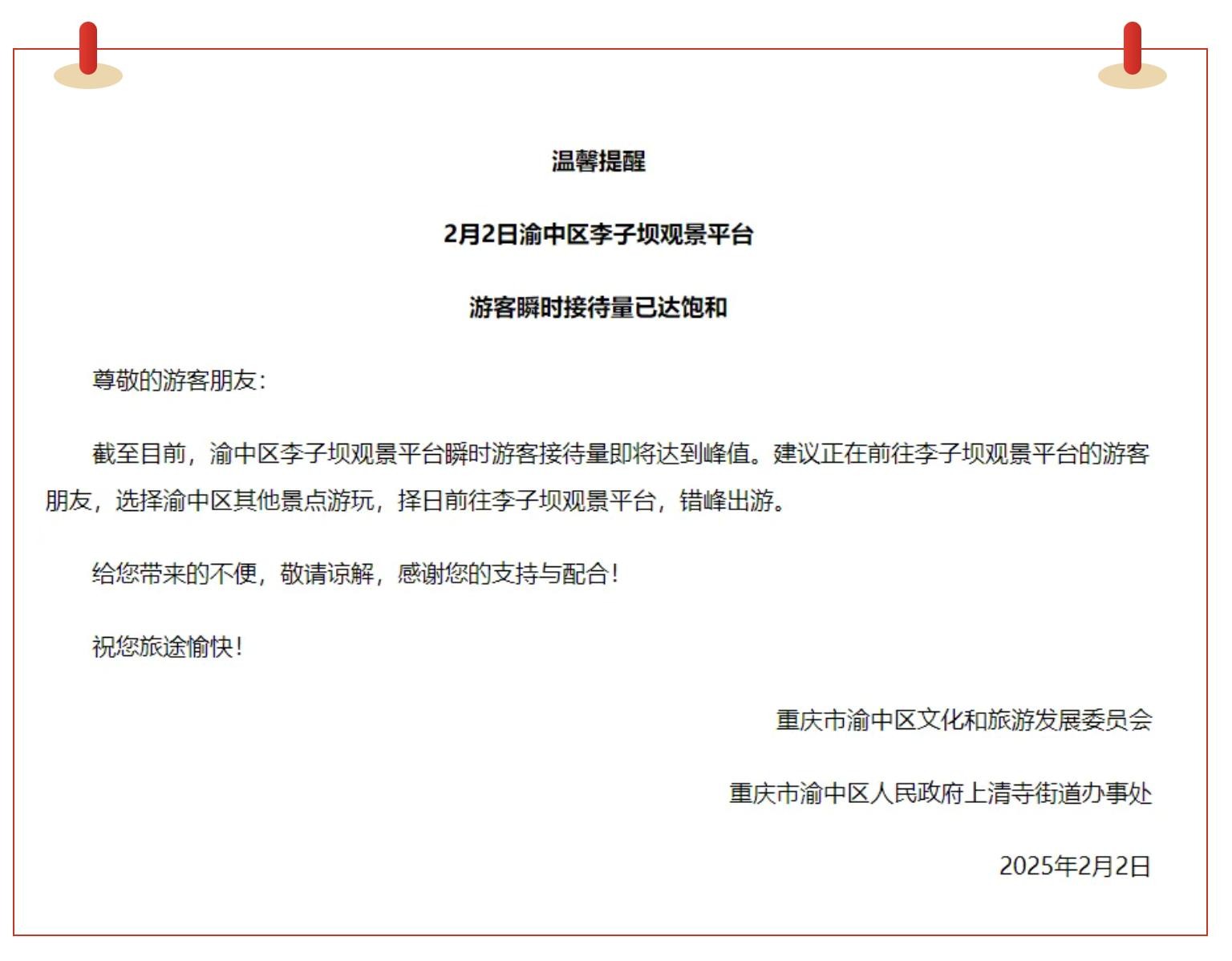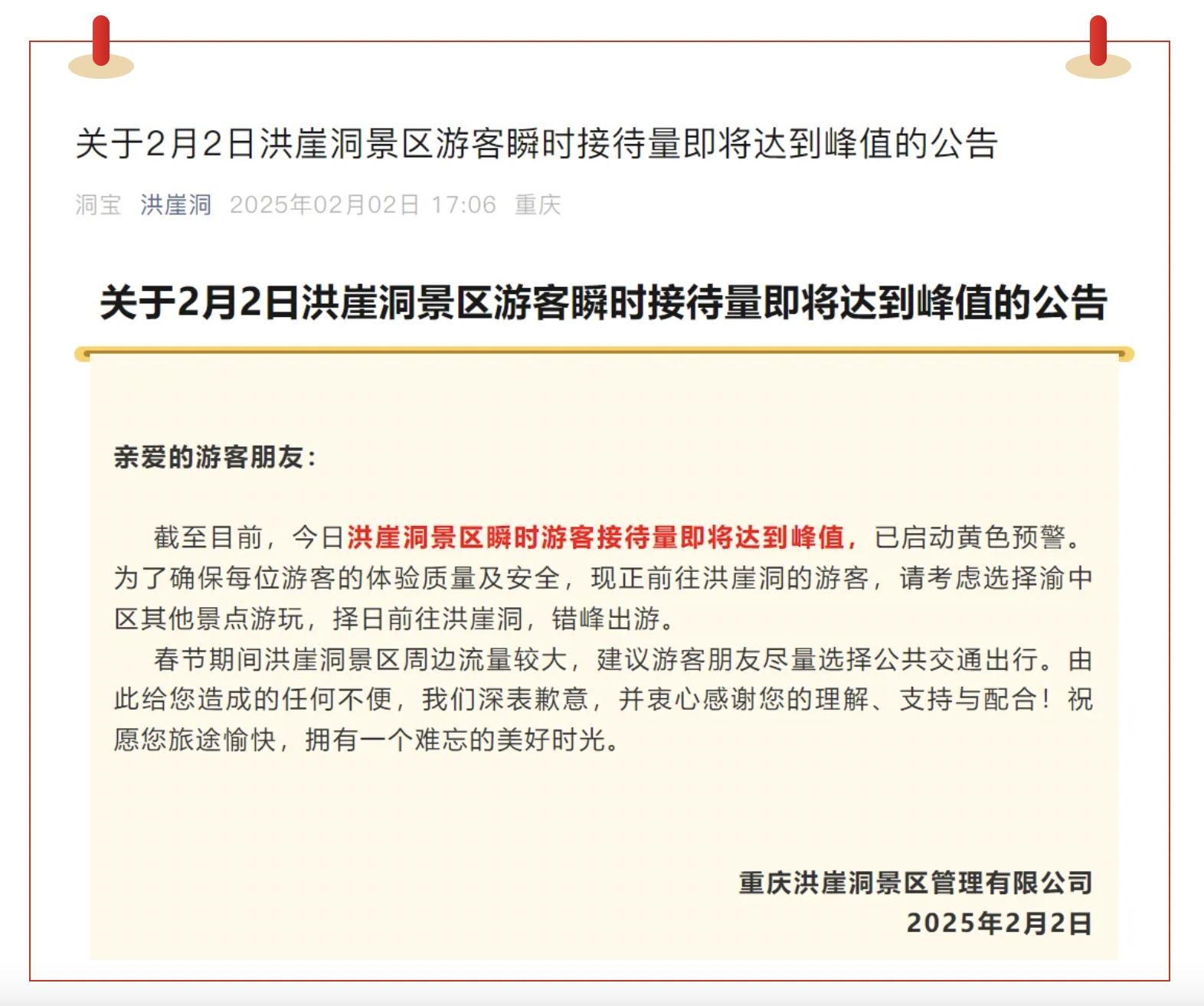 洪崖洞景区连续在2月1日和2月2日,发布游客瞬时接待量即将达到峰值的公告,截至2日17时,景区已启动黄色预警。建议正前往洪崖洞的游客,请考虑选择渝中区其他景点游玩,择日前往洪崖洞,错峰出游。