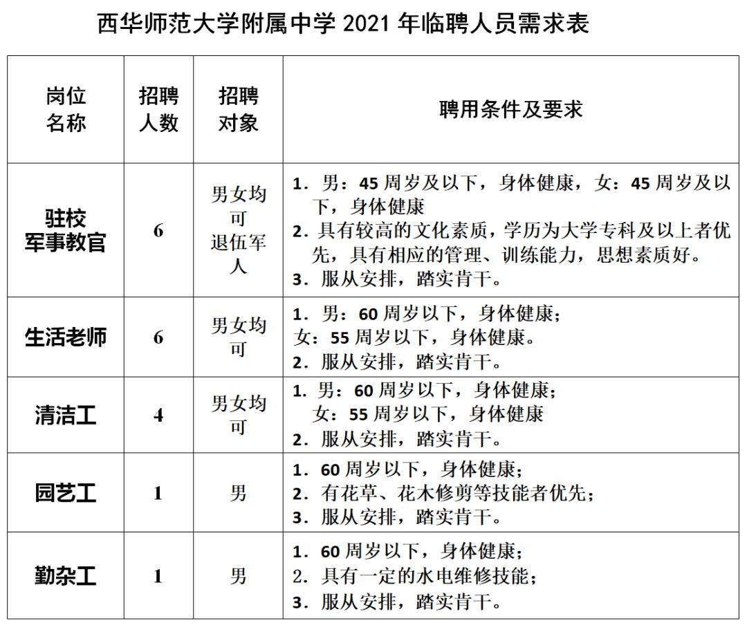 符合本公告及《西华师范大学附属中学2021年临聘人员需求表》(见报名条件)的人员;此次招聘人员属临聘人员性质。