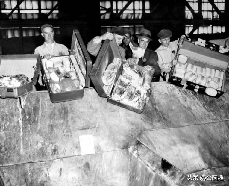 1928 年,海关官员搜查因涉嫌走私价值 150 万美元鸦片而被捕的四名船员。