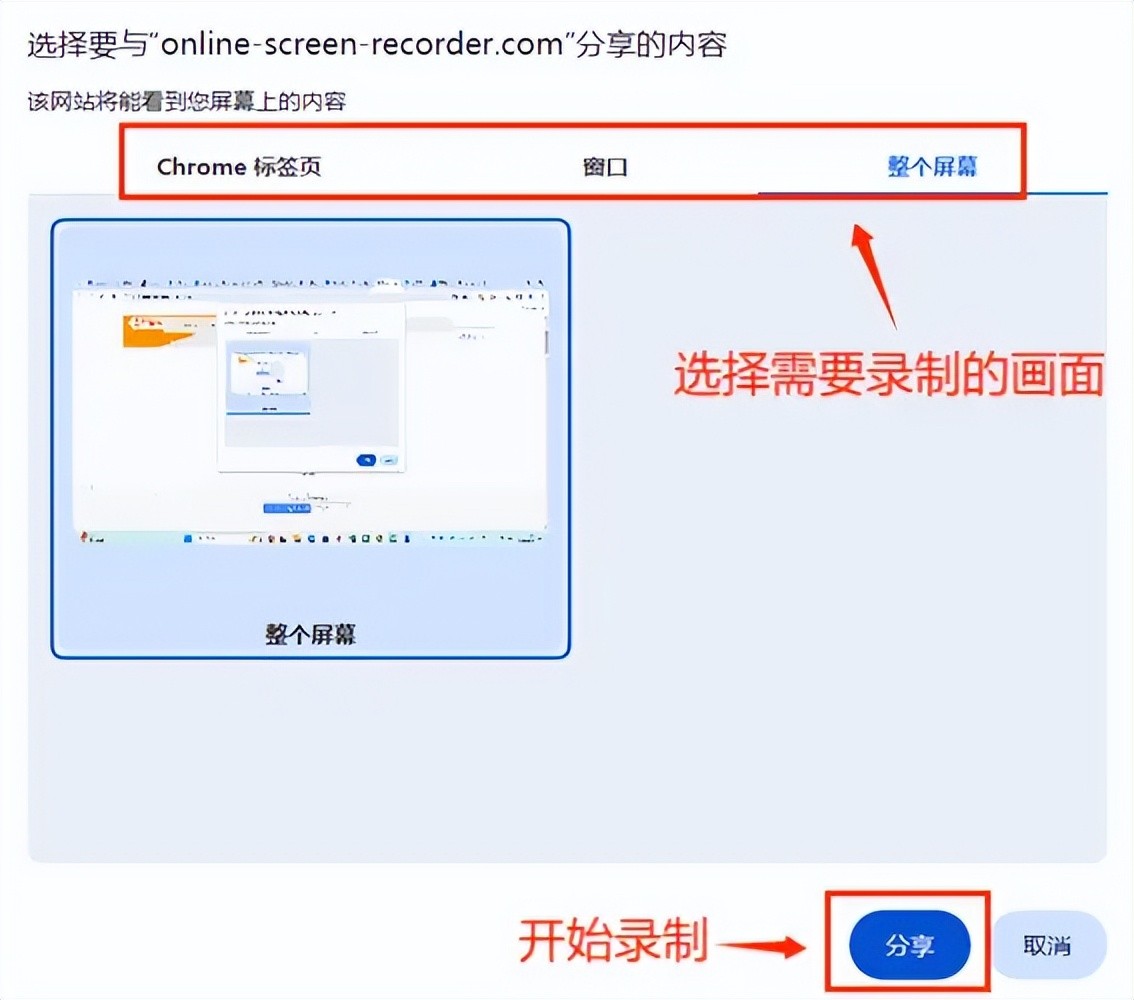 第三步:选择需要录制的区域/画面,然后点击【分享】开始录屏。