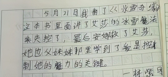 5月21日我看了《冰雪奇缘》这本书,里面讲了艾莎的冰雪魔法失控了,最后安娜救了艾莎,她也从妹妹那里学到了爱是控制她的魔力的关键。