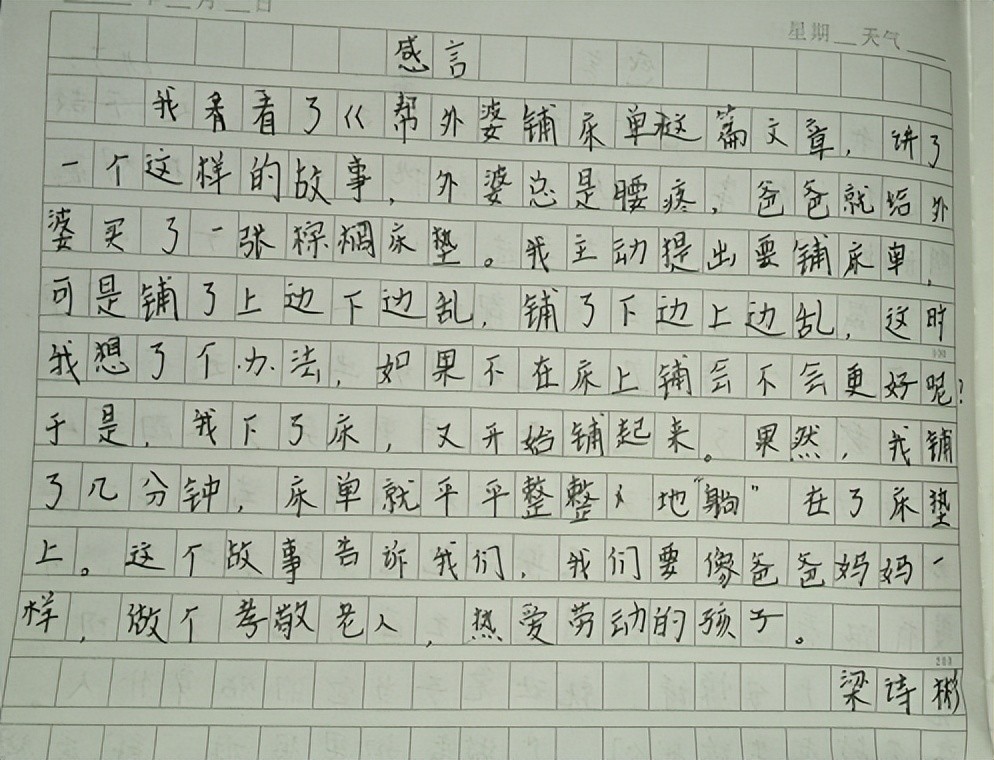 我看了《帮外婆铺床单》篇文章,讲了一个这样的故事,外婆总是腰疼,爸爸就给外婆买了一张棕榈床垫。我主动提出要铺床单,可是铺了上边下边乱,铺了下边上边乱,这时我想了个办法,如果不在床上铺会不会更好呢?于是,我下了床,又开始铺起来。果然,我铺了几分钟,床单就平平整整 地“躺”在了床垫上。这个故事告诉我们,我们要像爸爸妈妈一样,做个孝敬老人,热爱劳动的孩子。