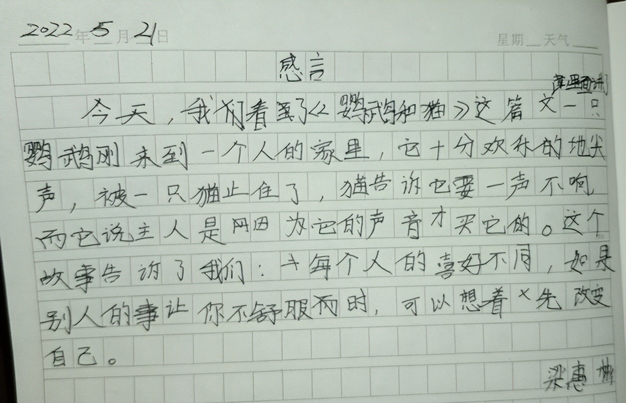 今天,我们看了《鹦鹉和猫》这篇文章,里面讲了一只鹦鹉刚来到一个人的家里,它十分欢乐地尖声,被一只猫止住了,猫告诉它要一声不响,而它说主人是因为它的声音才买它的。这个故事告诉了我们:每个人的喜好不同,如果别人的事让你不舒服时,可以想着先改变自己。