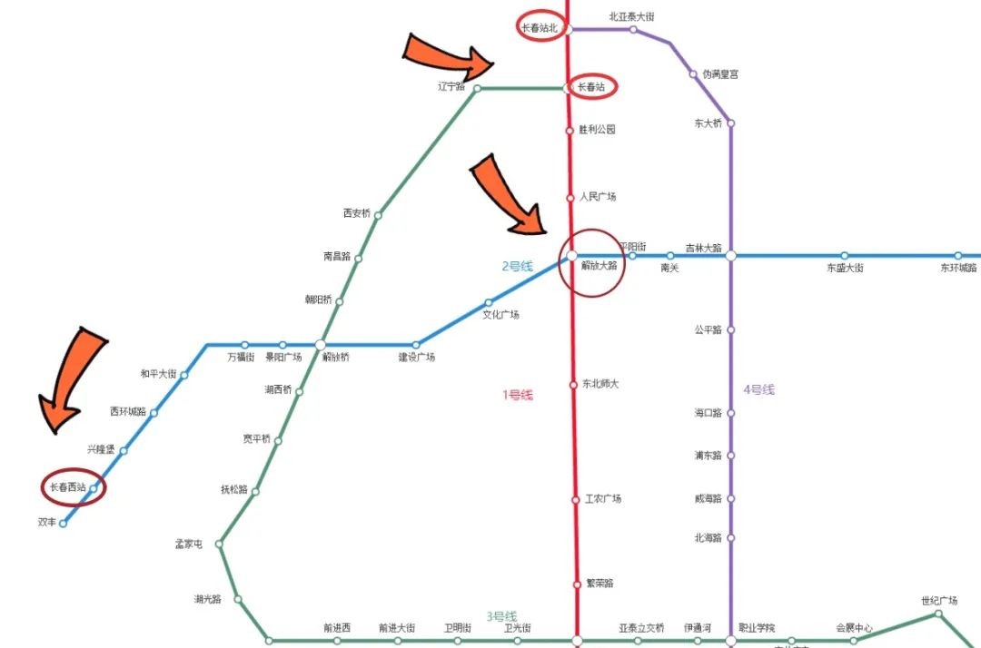 ◆长春站-长春西站:换乘中心乘坐地铁一号线,在解放大路站换乘二号线,到长春西站下车。