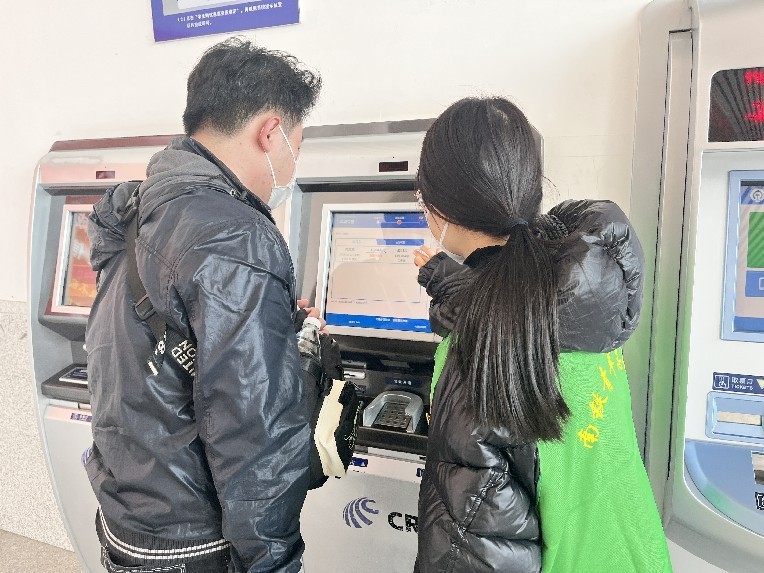 江西鹰潭北站,青年志愿者正在帮助旅客操作自助售票机。朱笑艺摄