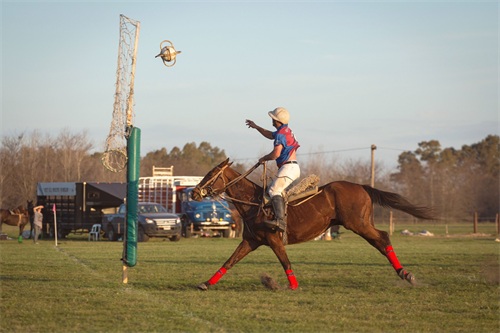 这项运动融合了马球、篮球和骑马,骑马的球员尽全力将橡皮球投入悬在空中的篮筐中。