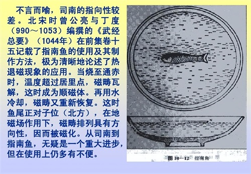 《武经总要》中详细介绍了制作指南鱼的方法:“用薄铁叶剪裁,长二寸,阔五分,首尾锐如鱼型,置炭火中烧之,侯通赤,以铁钤钤鱼首出火,以尾正对子位,蘸水盆中,没尾数分则止,以密器收之。用时,置水碗于无风处平放,鱼在水面,令浮,其首常向午也。”这是一种人工磁化的方法,它利用地球磁场使铁片磁化。即把烧红的铁片放置在子午线的方向上。而以一定角度放入水中,则使鱼磁化的有效磁场强度增大,磁化效果更好。