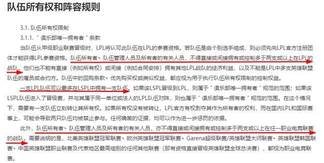一是“俱乐部单一所有权制”新规:拳头官方自2015年起在全球范围内实行了一项新规,即每个俱乐部在同一级别联赛只能拥有一支队伍,但允许一个俱乐部在不同级别联赛拥有多支队伍。这一新规的实行,也就意味着一旦某俱乐部在拥有LPL战队的情况下,其英雄联盟二队也晋级到了LPL联赛,那么必须要有一支战队被转让。而某俱乐部的LPL战队被降级,也可以通过收购其他俱乐部的LPL名额的方式,得以重新获得LPL参赛资格。