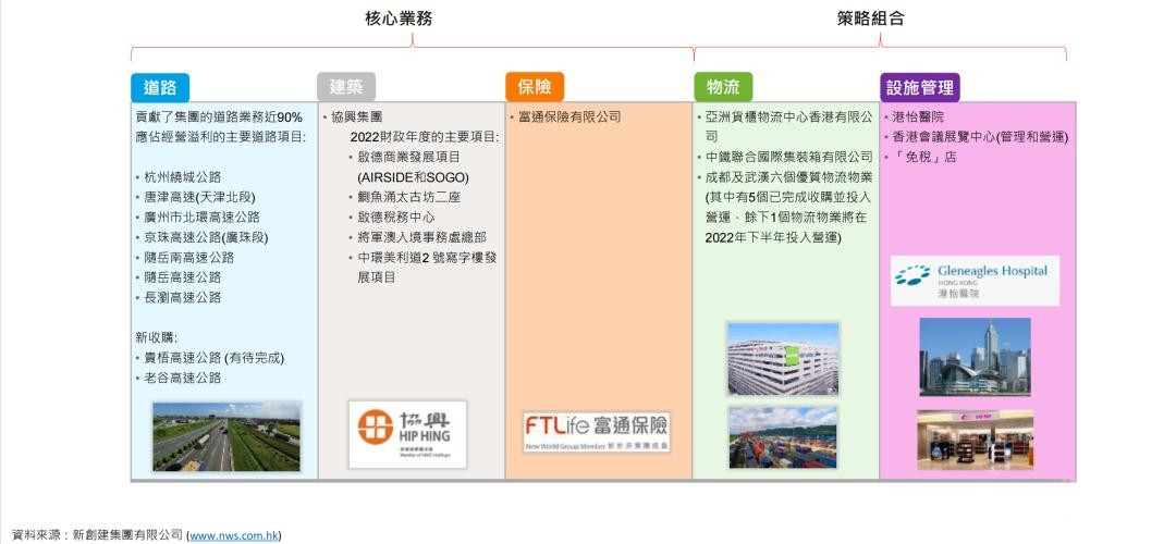 新创建集团有限公司(香港联交所股票代码:659)作为新世界发展有限公司(香港联交所股票代码:17)旗下的多元化产业上市旗舰企业,主要在内地和香港投资并经营多元化业务。其核心业务包括收费公路、商务飞机租赁、建筑和保险,而战略组合则涵盖物流及设施管理。