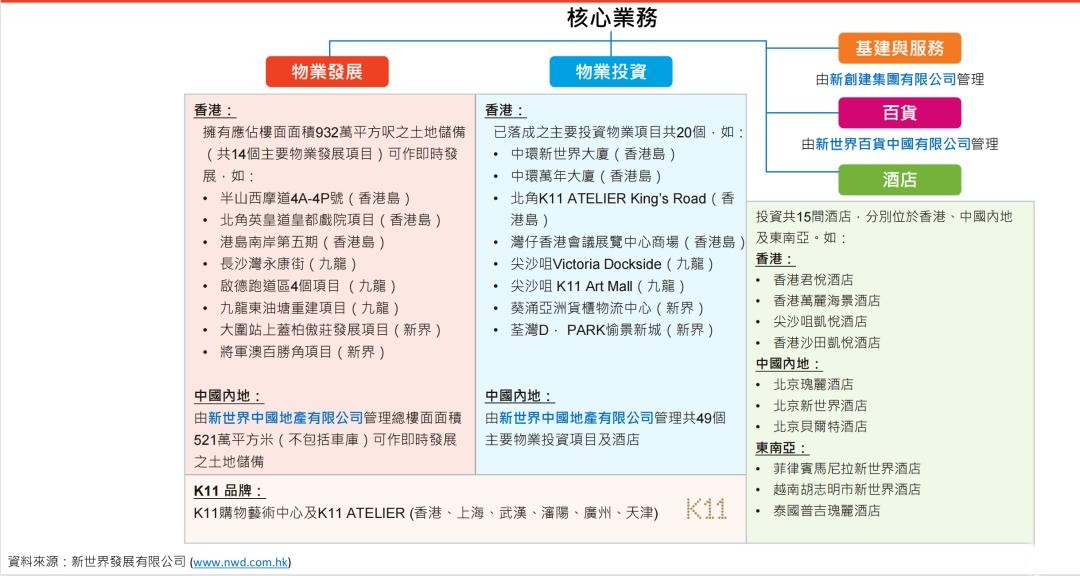 新世界发展有限公司(“集团”;港交所股票代码:00017)创立于 1970 年,1972 年在香港上市,是香港恒生指数的成分股之一。集团作为一个独具特色的品牌,主要经营业务涵盖物业发展、物业投资,以及投资和/或经营公路、商务飞机租赁、建筑、保险、酒店及其他战略性业务,业务范围遍及大中华地区,尤其集中在粤港澳大湾区。截至 2021 年 12 月 31 日,集团总资产约为 6,397 亿港元。集团旗下有两家上市公司,分别是新创建集团有限公司和新世界百货中国有限公司,并全资控股新世界中国地产有限公司。其业务领域包括物业发展、物业投资、基础建设与服务、百货、酒店等。