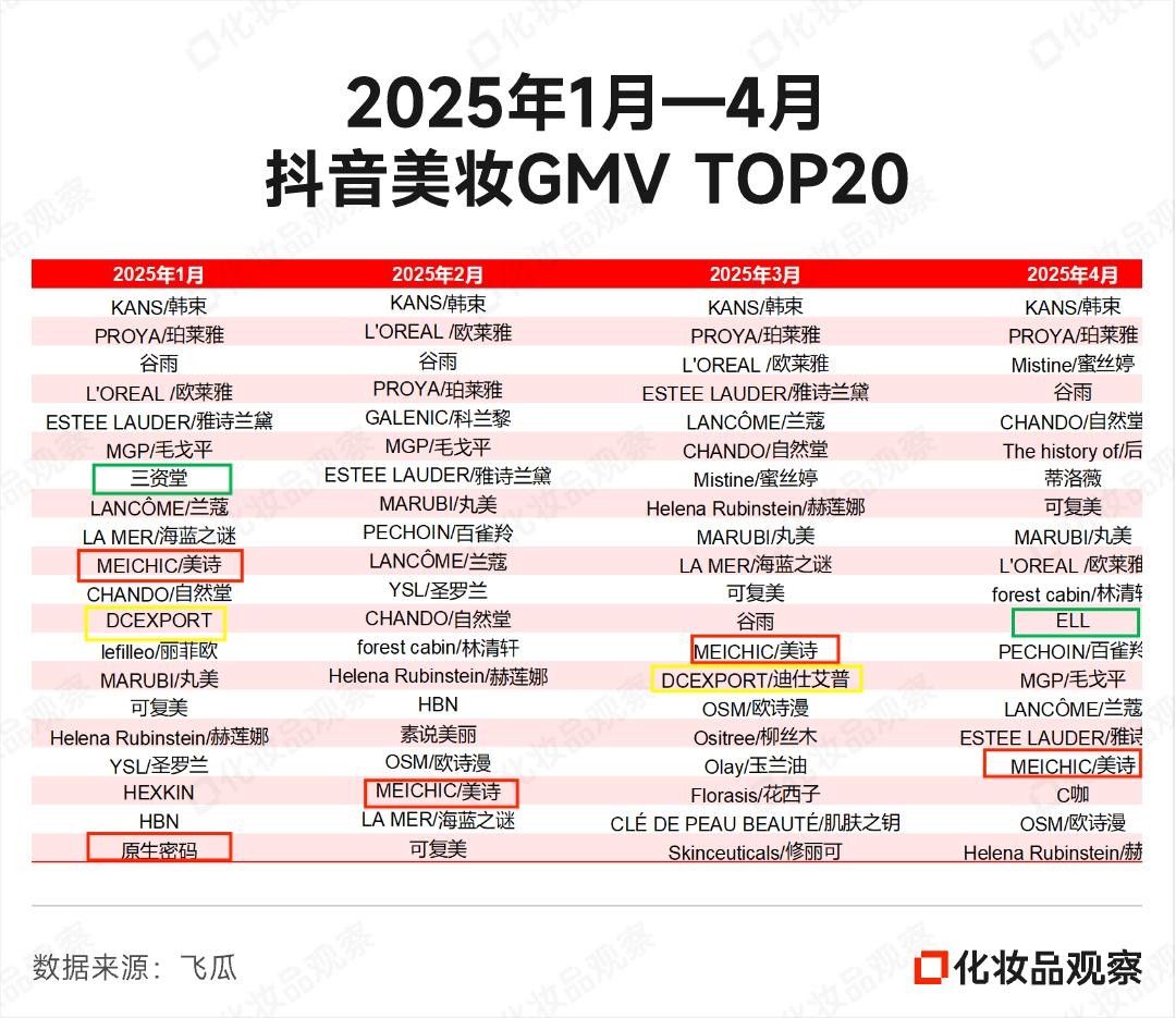 1月,抖音美妆GMV TOP20冲进4个白牌——三资堂、美诗、迪仕艾普、原生密码争相发力;