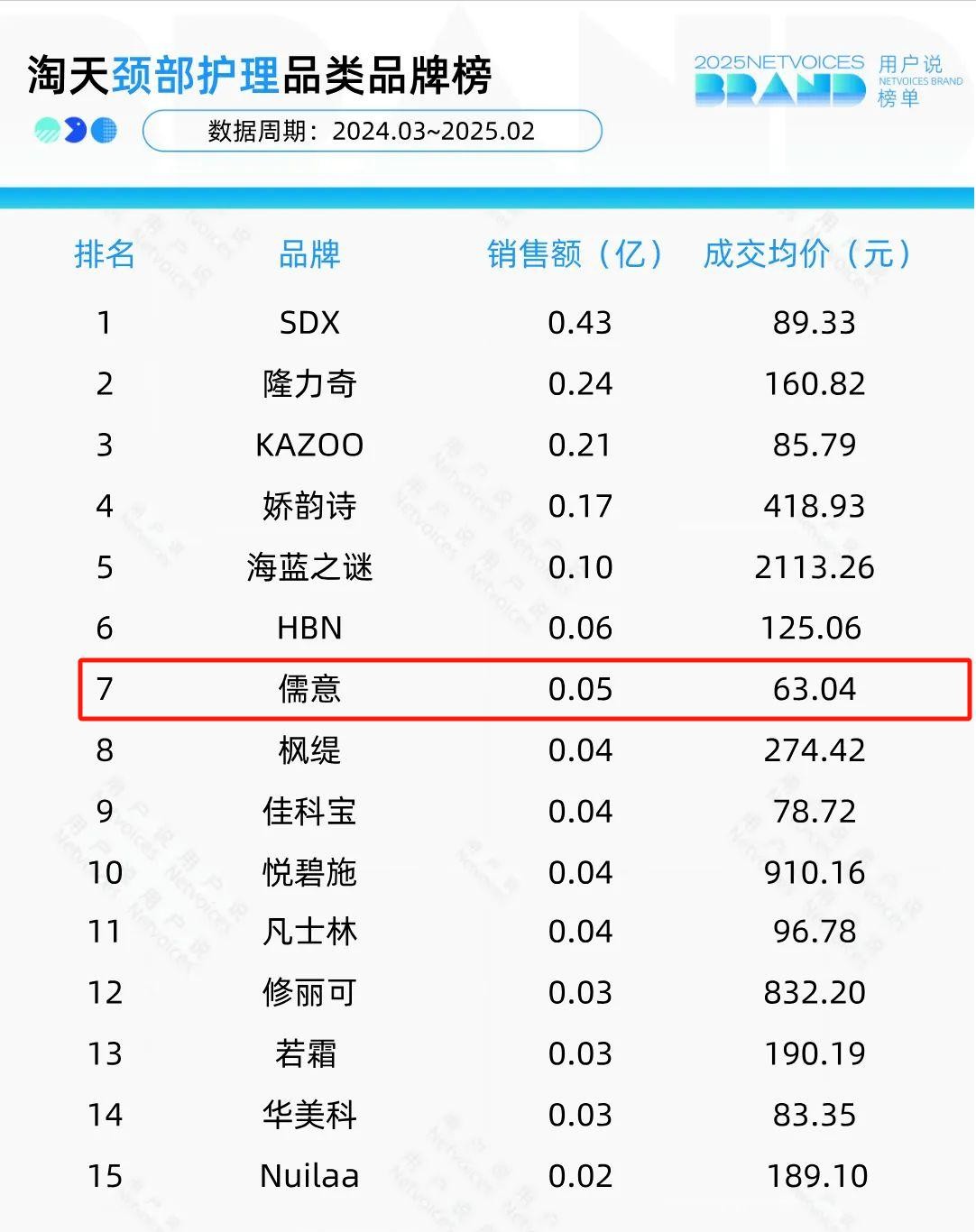 譬如儒意,跻身2025年2月MAT(2024.03~2025.02)“淘天颈部护理品类品牌榜”TOP7,其中,成交均价超百元的品牌占60%,儒意以63.04元的均价垫底,契合下沉市场及价格敏感人群的需求。