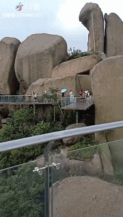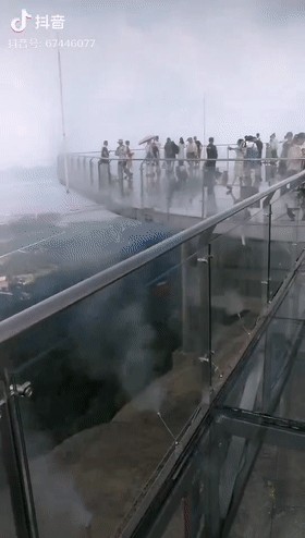 悬挑在悬崖外的全透明玻璃上