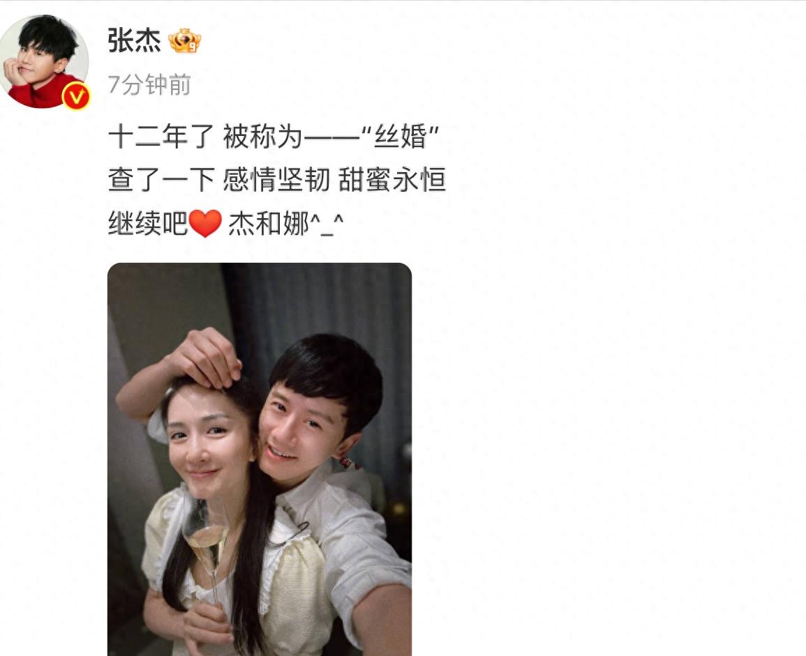 在社交媒体上,张杰深情地写道:“十二年了——被称为“丝婚”,查了一下,感情坚韧,甜蜜永恒。继续吧,杰和娜。”