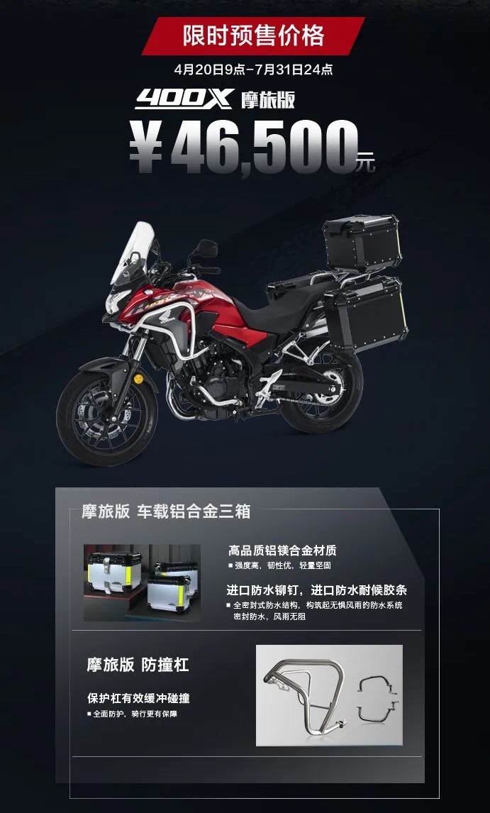 从本田官方目前公布的这个售价来看,虽说还只是限时预售价格,但无论怎么说,37000的CB400F、40700的CB400X、46500元的CB400X摩旅版(配备铝合金三箱的)这个价格是真的香~