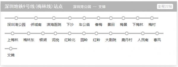 深圳地铁9号线西起南山区红树湾站,东至罗湖区文锦站,横跨深圳市南山、福田、罗湖三大最繁华的区域。正线全长约25.39公里,设车站22座,依次为:红树湾南、深湾、深圳湾公园、下沙、车公庙、香梅、景田、梅景、下梅林、梅村、上梅林、孖岭、银湖、泥岗、红岭北、园岭、红岭、红岭南、鹿丹村、人民南、向西村、文锦,其中换乘站10座。
