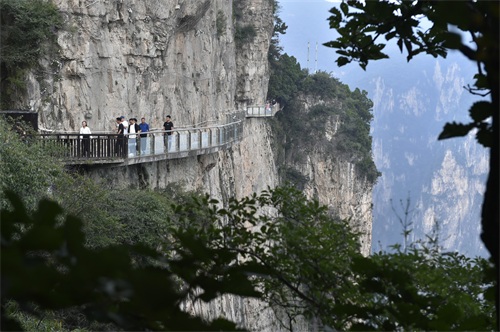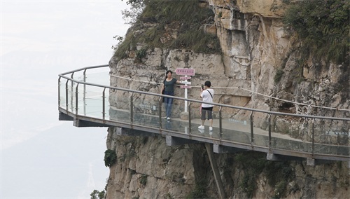 9月17日,游人在云台山景区的玻璃栈道上留影。 新华社记者 鲁鹏 摄