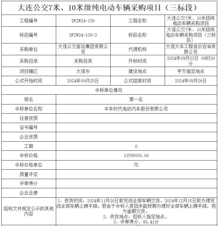 9月25日,大连公共资源网发布了大连公交7米、10米级纯电动车辆采购项目中标公示。本次招标三个标段均由中车电动中标,其中,一标段中标价格为30078500元,二标段中标价格为565765500元,三标段中标价格为11595000元。