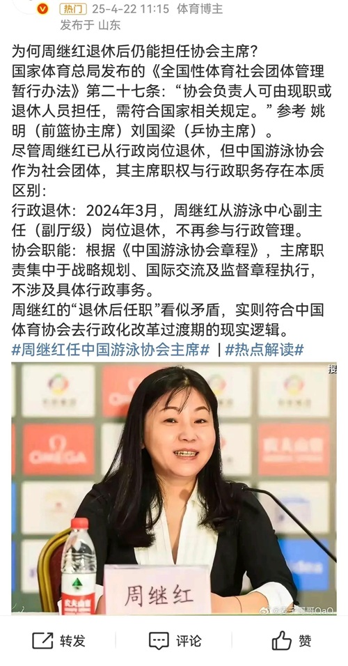 据官方的解释是,周继红是从行政岗位退休,但游泳协会是社会团体,不涉及具体行政事务。