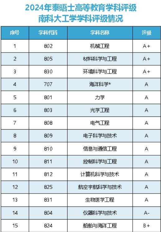 南科大A学科数量达到了10个:海洋科学、力学、光学工程、电气工程、电子科学与技术、信息与通信工程、控制科学与工程、航空宇航科学与技术、生物医学工程。