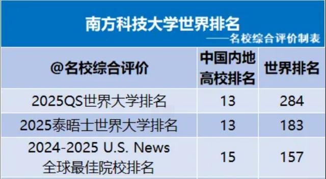 2025年QS世界大学排名:南方科技大学位列中国内地高校12名,世界排名284。