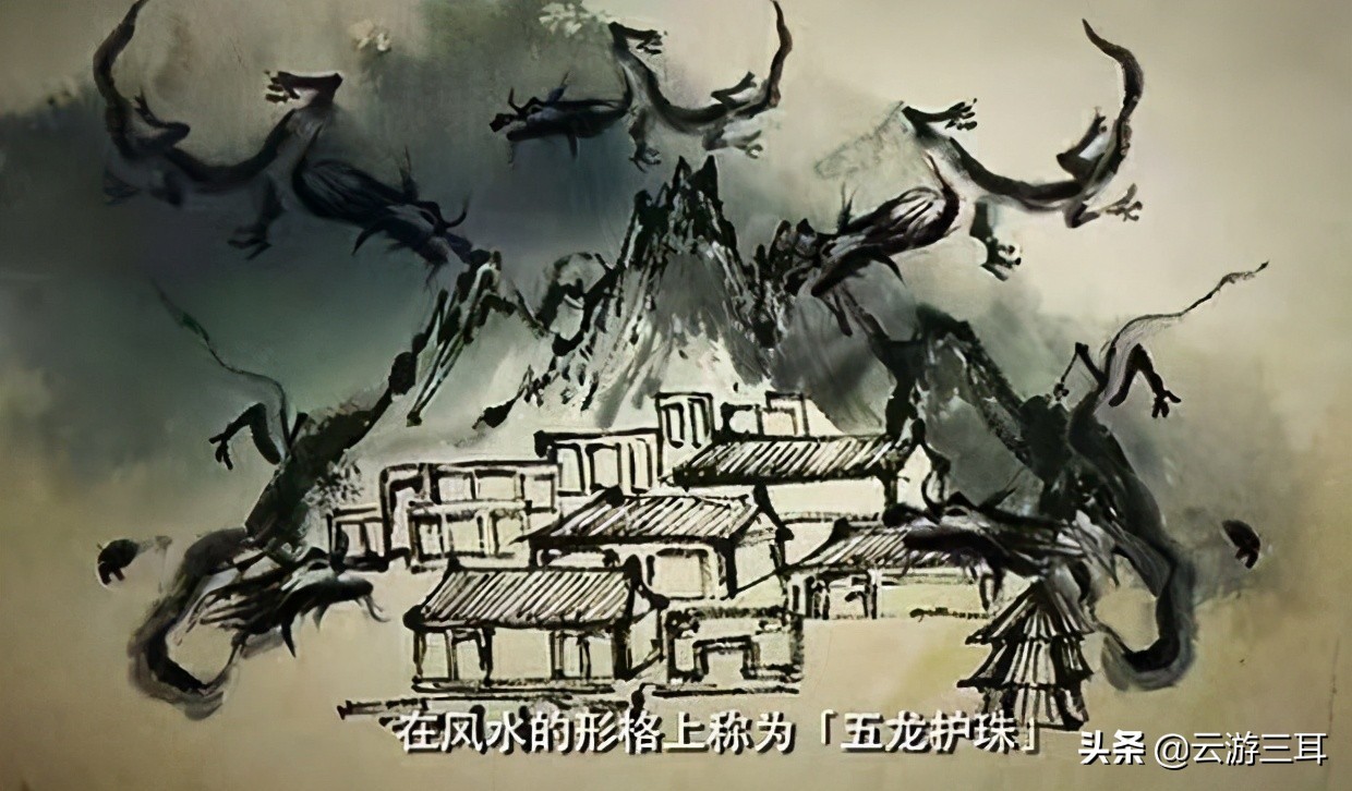 悦城龙母庙前临西江、后靠龙山,青、黄旗山分列两旁,呈拱卫、环抱护珠之势。整个龙母庙建筑群在五龙山围绕之下,与周围的山水和谐相契、浑然一体,形成了风水形格上的“五龙护珠”之势。