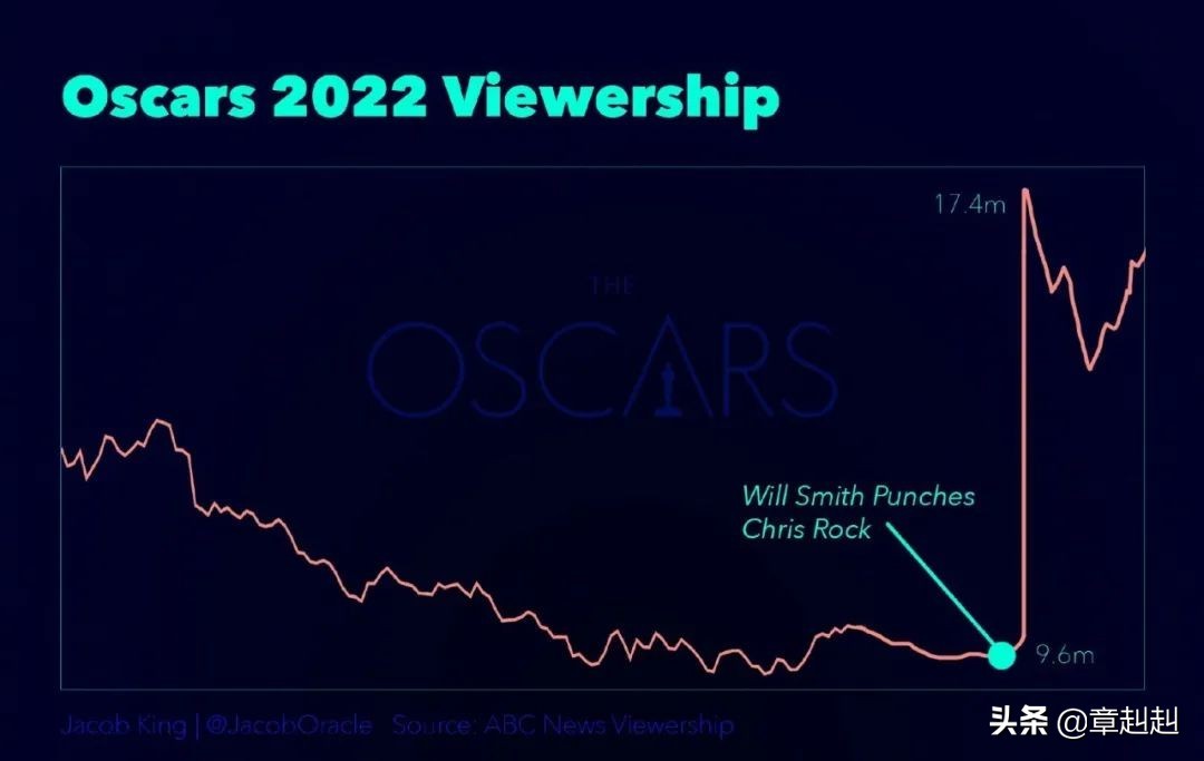 Hello,大家好,我是章赳赳,前天是一年一度奥斯卡的颁奖典礼,虽然奥斯卡最近几年的收视率是一年不如一年,但今年因为威尔史密斯的一记耳光,直接扇出了收视的希望。