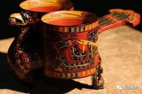 它由两只竹身圆筒杯、木质凤鸟身和微微上翘的鸟尾等部分组合而成。凤首昂起,口中衔有一颗彩绘漆珠。是夫妻双方洞房花烛夜合饮交杯酒的。这在当时属于首次发现,是“交杯酒”这个历史名词的实物佐证。