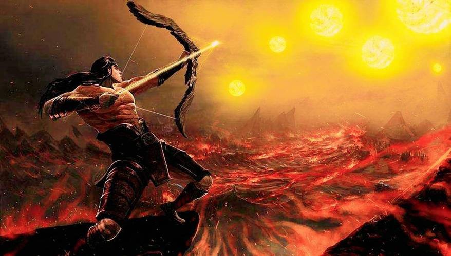 传说尧时,十日并出草木枯死,又有猰貐、凿齿、九婴、大风、封豨、修蛇等恶兽四处为害,羿受尧的命令除去这几种恶兽,又射去九日,为民除害。