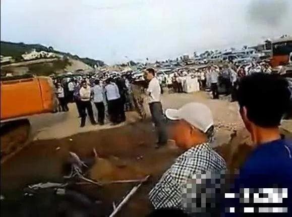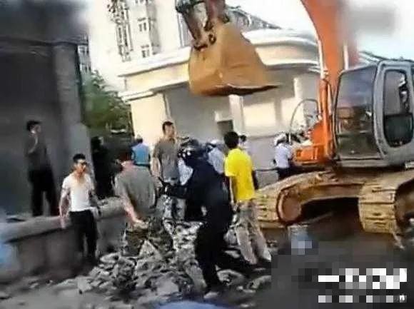 解放军拦在挖掘机前方,城管上前阻拦,双方发生撕扯。