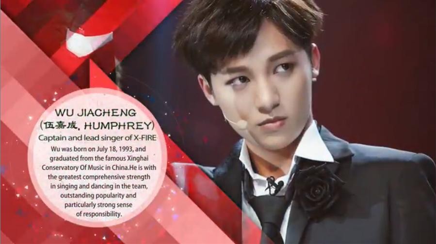 伍嘉成:X-FIRE全能队长,全团灵魂。1993年7月18日出生于广东台山,毕业于星海音乐学院流行音乐系,台风独特多变,综合唱跳实力为组合内最强,更有超强人缘和综艺感。自比赛期以来,以极强的责任心、领导力和凝聚力,为团队成员所信赖喜爱,成为众望所归的实力队长。