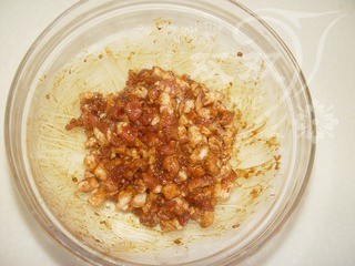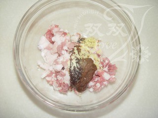 3. 五花肉切丁,放入姜末、甜面酱、盐、白糖、白胡椒粉、生抽。