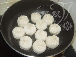 11. 平底锅烧热,倒油,转小火,将包子码入,预留空隙,略煎。