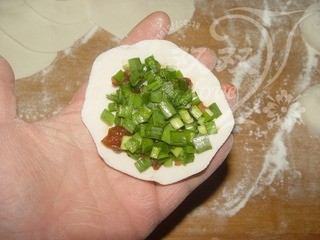 9. 取一个包子皮,依次填上韭菜、猪肉、韭菜,压实。