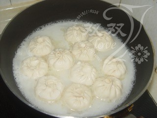 3、大火将水基本烧干后,转小火,将包子底部煎至金黄色即可出锅。