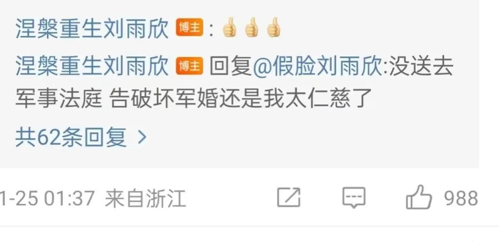 然而,为什么刘雨欣最终决定不起诉张檬破坏军婚呢?她在回应中称这是因为自己太仁慈了。对此,有网友表示理解,认为刘雨欣或许是想保护张檬的形象和名誉,避免继续卷入争端。然而,也有人对这种仁慈心态表示质疑,认为刘雨欣的回应可能掩盖了更深层次的原因。