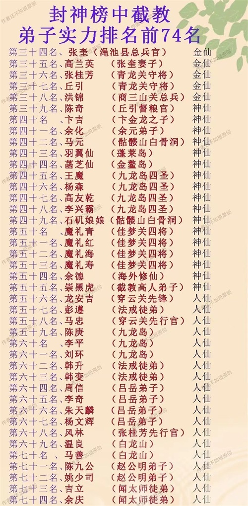下面用二张大图总结出所有截教弟子共74人的境界修为实力排名情况。