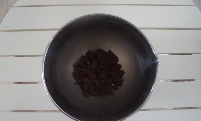 巧克力币提前掰成小块,我用的是可可含量百分之65的巧克力币,如果你用的可可含量更高,可以适当增加一些放在淡奶油里白糖的用量,如果你用的可可含量更低,那就可以适当减少一些加在淡奶油中白糖的用量。