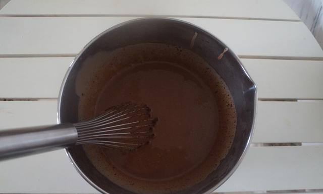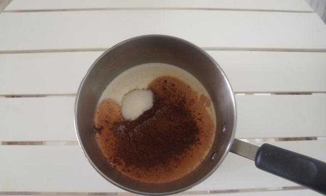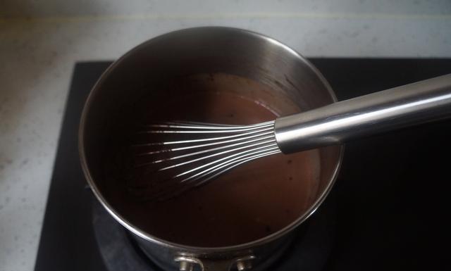 小火加热淡奶油,并且边加热边用蛋抽搅拌,直至可可粉和白糖融化。