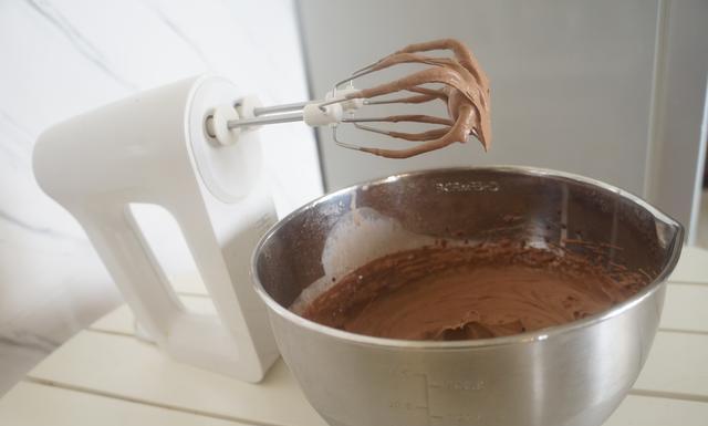 冷藏后的奶油用电动打蛋器打发就可以使用了。可以在打发的过程中尝一下味道,觉得苦就加糖粉。