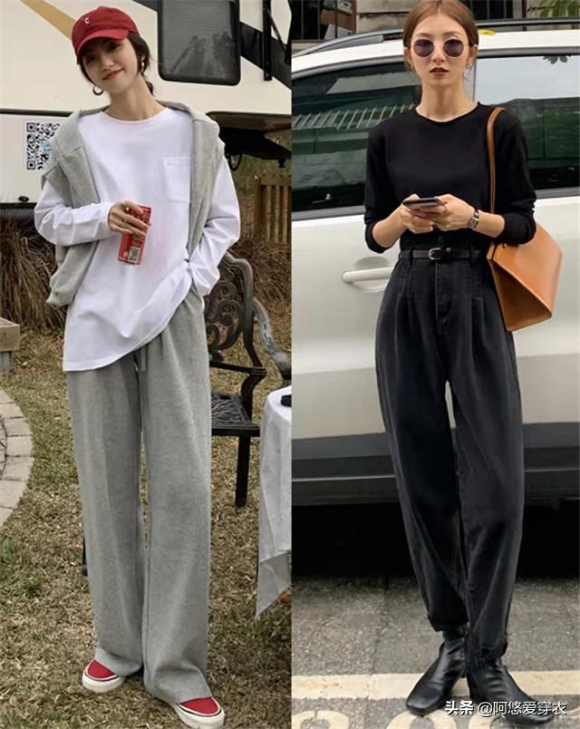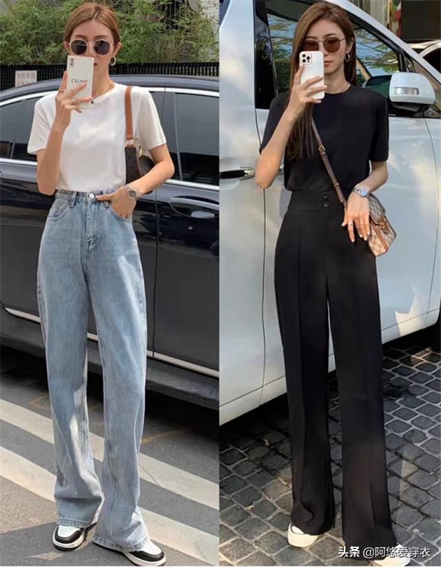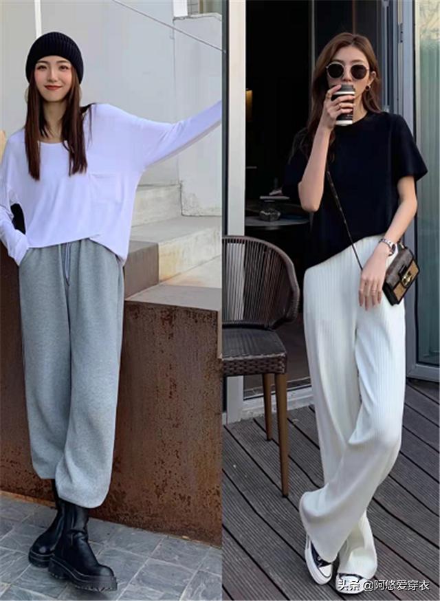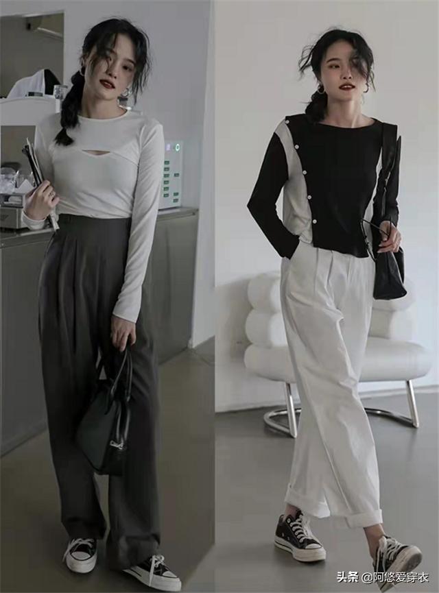 像下面这些博主,用黑白色的懒人t恤凹造型,宽松的款式也可以遮住多余的赘肉,然后再通过搭配高腰的裤子修饰身材,会显得很时尚。