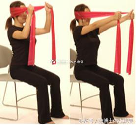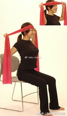 弹力带置于头部后方,双手抓住弹力带,头部前后对弹力带进行抗阻运动,类似于挤出双下巴的动作。一组10次,一天2组。注意,弹力带为最小负荷。