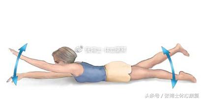 俯卧于垫子上,双手双脚离开垫子,头部抬离地面,双手双脚开始有节律的一上一下,类似于划水的动作。注意,在进行开动作的过程中,保持躯干的稳定,在划水时,上下肢和头部均不要接触垫子。一组10次,一天2组。