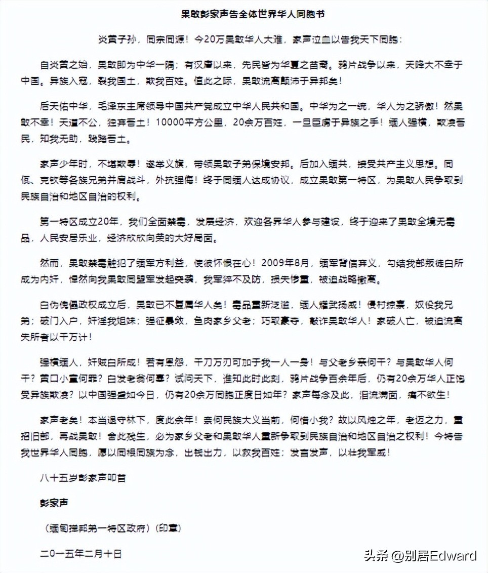 经过几年的折伏,2015年,85岁的“果敢王”彭家声发出一封《泣血告全球华人书》,其中有“试问天下谁知此时此刻,鸦片战争百余年后,仍有20万华人正饱受异族欺凌。以中国强盛如今日,仍有二十余万同胞正度日如年,家声每念及此泪流满面痛不欲生!”。这封公开信可谓是字字泣血,句句锥心,然而却收效甚微,没能引起华人世界的关注。试想一下,当初如果出钱出力帮助彭家声重新夺回果敢,恐怕也不至于出现今天的恶果。