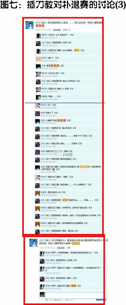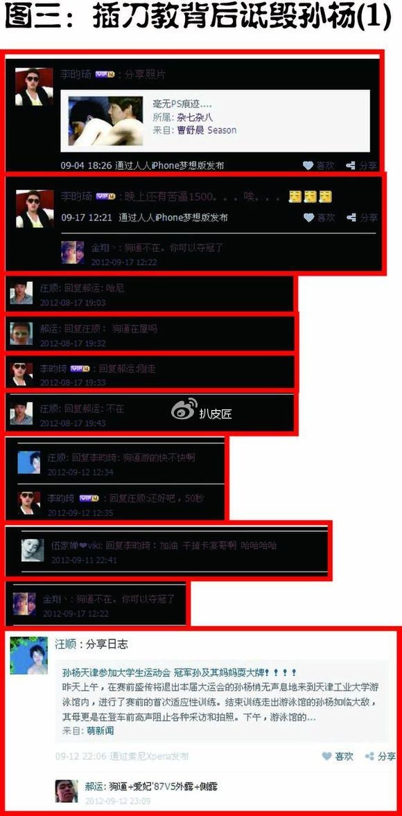 其实之前通过一些关于插刀教的言论,以为只是在背后说几句不好的话而已,远没有想到游泳队的这几个人,甚至是孙杨的师妹,竟然会这么恶毒,恶毒到诅咒孙杨断腿只能参加残奥会。当然肯定有人说孙杨被这么多人骂,可见孙杨也是有问题。但是我想说从上面的截图来看插刀教都是在嫉妒孙杨,为什么成绩这么好,还TM是冠军。木秀于林风必摧之,奈何树欲静而风不止。