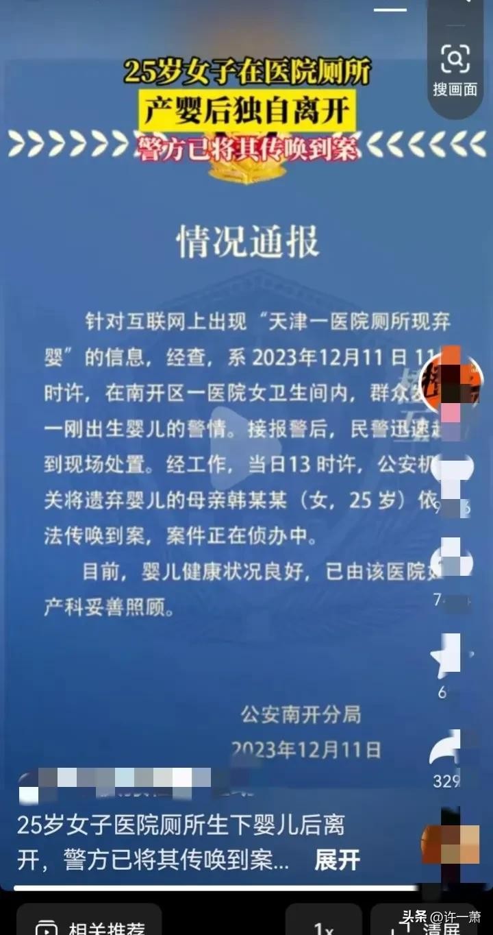 刚刚刷抖音的时候,看到一则新闻,新闻报道说,在12月11日天津市南开区一医院发现一婴儿被遗弃到厕所内。