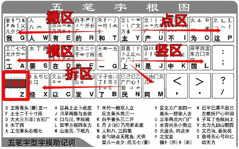 大家都知道所有汉字都是由基本的笔划组成的,具体来说,就是【横】【竖】【撇】【点】【折】,五笔字根就是根据这五种笔划进行区域划分并形成口诀的,具体如下:
