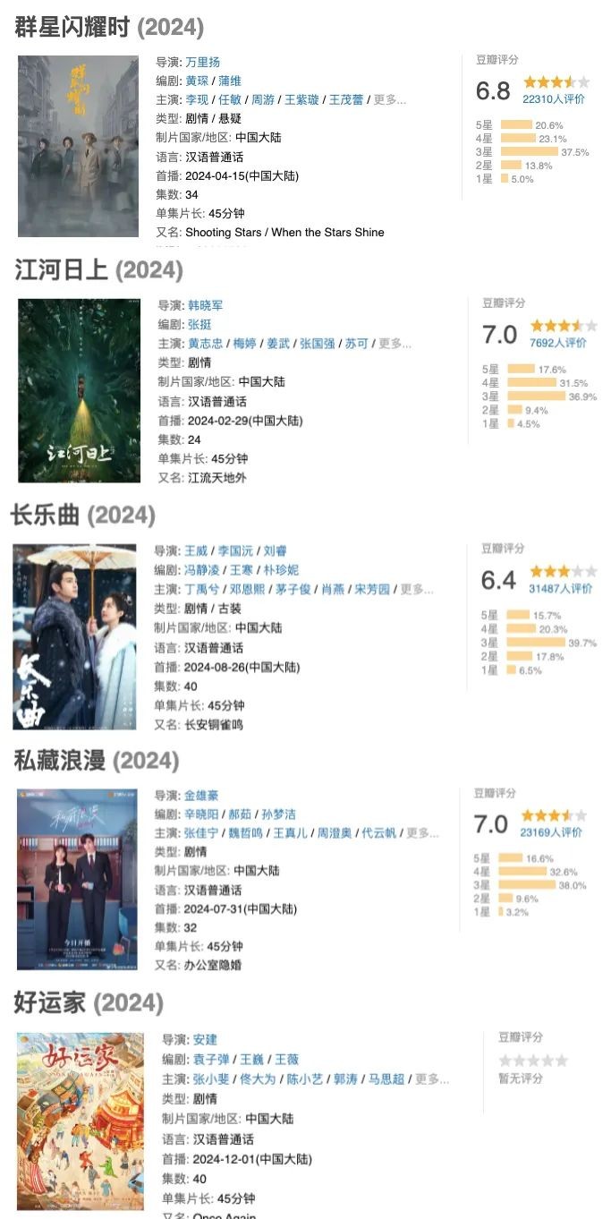 一是芒果自制独播类型剧。如《群星闪耀时》《江河日上》《长乐曲》《私藏浪漫》《好运家》,可以发现一年间湖南卫视上星的芒果自制剧类型较多元,而整体表现中规中矩,中等制作规格,质量有一定保证但出圈概率较低,上述四部剧集豆瓣评分分别6.8分、7分、6.4分,7分,突出一个“稳定但不出彩”。