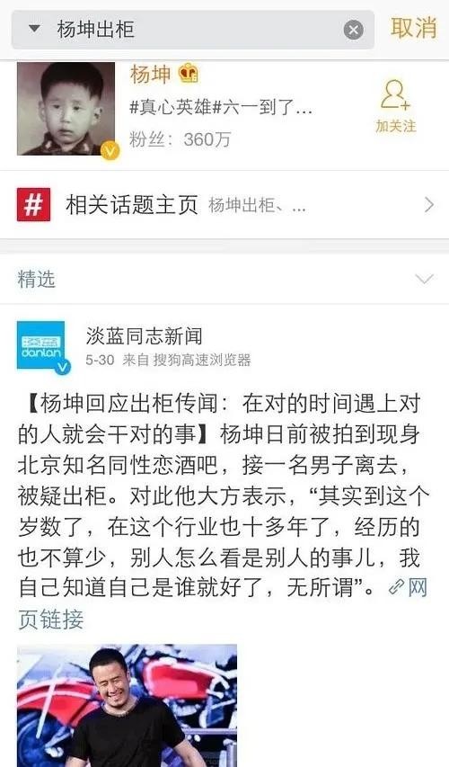 15年的时候杨坤被拍到深夜驾车现身北京工体一酒吧附近等人,这个酒吧叫destination(目的地酒吧),在当时是北京最大,最有名的gay吧。